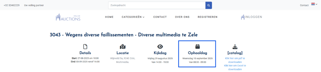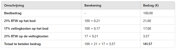 En plus de la TVA standard (21 %), vous payez des frais d’enchères. Ceux-ci sont de 17 %, sauf indication contraire. Nous appelons cela la commission d’acheteur (buyer’s premium). Cette commission est ensuite à nouveau majorée de 21 % de TVA, sauf indication contraire.